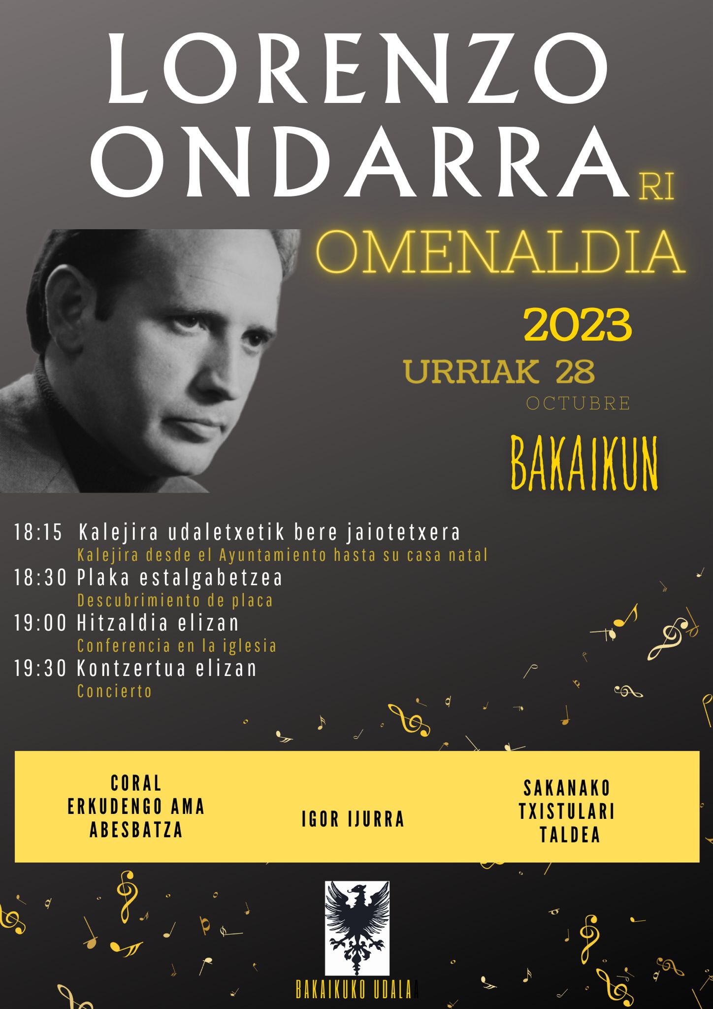 Bakaikuk azken hamarkadetako euskal musikaren ordezkari nagusietako bat izandako Bakaikuarra omenduko du: Lorenzo Ondarra (1931-2012), Kaputxino, konpositore eta organista, -1969an Musika Sari Nazionala irabazi zuena-, koru-konposizioan eta txistuan erreferentea.