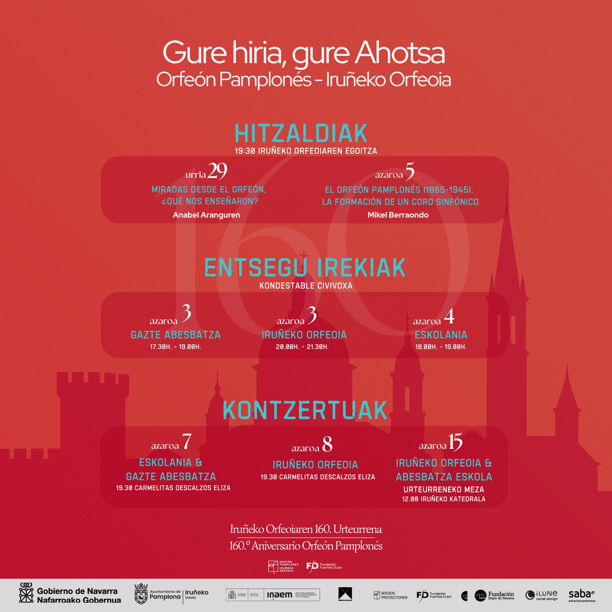 Iruñeko Orfeoiak bere 160.urteurrena ospatzeko hitzaldiak, kontzertuak eta entsegu irekiak antolatu ditu. Kontzertu eta entsegu irekitan Orfeoiak eta bere Koru eskolako bi abesbatzek parte hartuko dute: Eskolania eta Gazte Abesbatza.