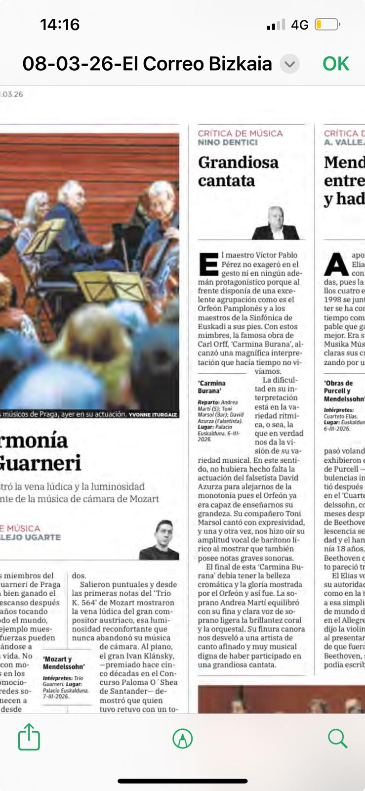 « Le Maestro Víctor Pablo Pérez n'a pas exagéré dans son geste ni dans aucun geste de direction car à l'avant-garde il avait à ses pieds un excellent groupe tel que l'Orfeón Pamplonés et les chefs d'orchestre de l'Orchestre Symphonique National Basque. Avec ces osiers, la célèbre œuvre de Carl Otff. 'Carmina Burana' a atteint une interprétation magnifique que nous n'avions pas vue depuis longtemps. »